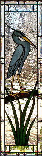 | This great blue heron is resting quietly on a log. A very nice mate for this piece is IMG0163. The heron, grasses and log are opalescent glasses. The background shown is clear, textured waterglass. Please ask for a quote for a custom sized piece or if you would like a different background glass. |